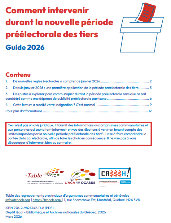 Dans le cadre de mon travail pour la Table des regroupements provinciaux d’organismes communautaires et bénévoles j’ai rédigé un guide pour aider les organismes communautaires autonomes du domaine de la santé et des services sociaux (OCASSS), et l’ensemble des groupes communautaires autonomes, à s’y retrouver dans les nouvelles règles électorales en vigueur depuis janvier 2026.