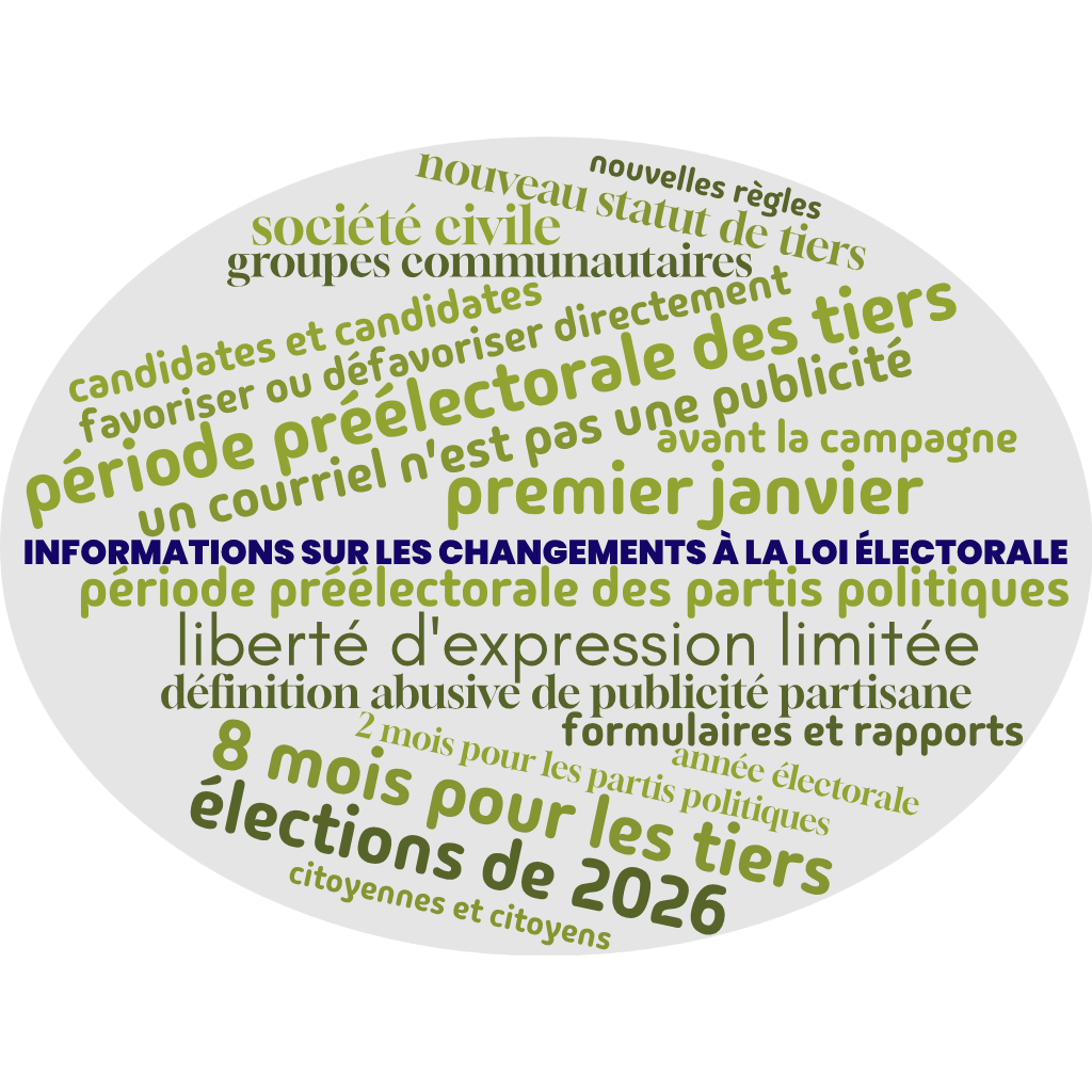 Durant une campagne électorale, la Loi limite déjà la liberté d’expression de la société civile en interdisant de dépenser pour diffuser du contenu directement ou indirectement partial, à moins d’être agentes et agents officiels d’un parti ou d’une personne candidate. Par exemple, durant les 4-5 semaines que dure la campagne électorale, un groupe communautaire voulant continuer d’intervenir selon sa mission sociale doit user de prudence s’il diffuse des analyses de plateformes électorales ou une position sur un enjeu. Il risque en effet des amendes s’il effectue une dépense pour diffuser du contenu pouvant être considéré comme favorisant ou défavorisant directement ou indirectement, l’élection d’une personne candidate ou d’un parti.[1]